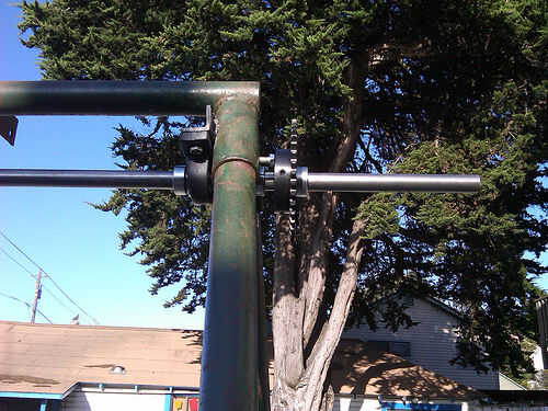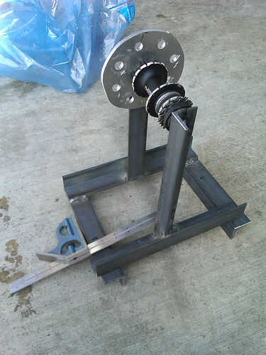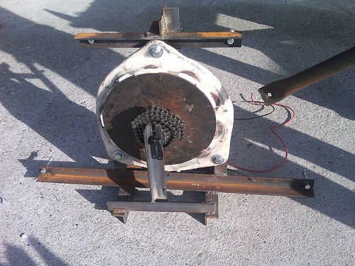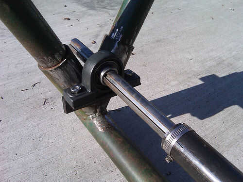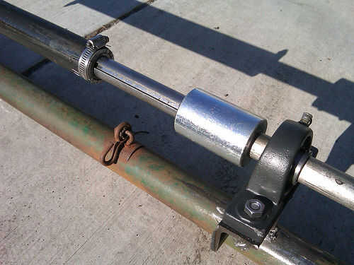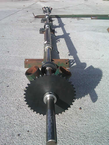 Materiales utilizados incluyeron 4 bloques de almohadilla, 4 rodillos embragues, afinado de 9 pies de eje de transmisión, tubos, alrededor de 20 pies de hierro de ángulo de acero estándar, mucho lag tornillos arandelas y tuercas, un concentrador de bicicleta trasera con un punto de anclaje de freno de disco, unos engranajes de bicicleta trasera sola velocidad, alguna cadena de la motocicleta, un montón de collares de eje, 4 collares de tubo y un engranaje que encaja el eje.