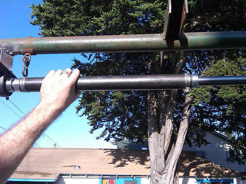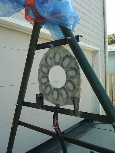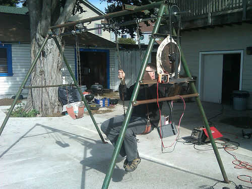 Después de construir http://www.scoraigwind.com/ motor de imán permanente de flujo Axial de Hugh Piggott y adaptarlo a una bicicleta estacionaria, me preguntaba qué podía usar para hacer pequeñas cantidades de electricidad. Después de la votación de amigos y familiares para el viejo equipo de tierra del juego, un padres amigos donaron un antiguo conjunto de columpios. Se construyó siglos atrás pero super resistente y después un poco TLC estaba listo para una nueva vida.