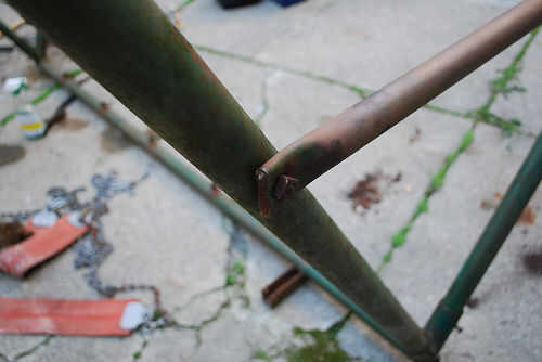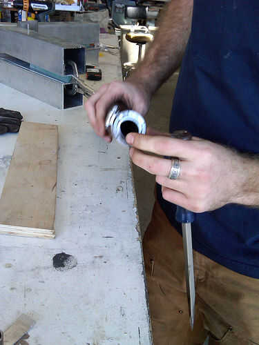 herramientas utilizadas incluyeron un soldador 110 mig estándar, porta banda, archivos y raspadores, mazo de caucho, amoladora, herramientas de mano de misc como tornillo controladores etc, taladro, mano taladro, Marina spray antioxidante, plomería Llave, vise grips y un interruptor de cadena de motocicleta y ensamblador.