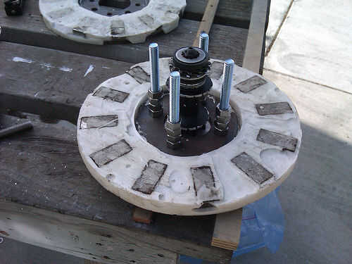 El diseño fue bastante directo, que usé Mcmaster Carr y algunas empresas locales (San Francisco) para la maquinaria. Básicamente fueron juntos durante un par de fines de semana. Utiliza el generador de Hugh Piggott puesto que ya había hecho lo y me gusta el diseño para aplicaciones de bajo torque de baja velocidad, pero supongo que cualquier otra cosa como un alternador o motor de caminadora funcionaría así.