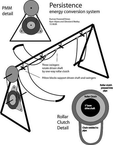 * (Actualización)quería dejar claro que las placas de rotor de imán son muy pesadas y actúan como un volante de inercia, alisa pero no "golpear" el poder. También la cadena no se mueve hacia adelante y hacia atrás, pero en una sola dirección. Los swingers sólo afectan el eje cuando se mueven hacia adelante, en su viaje de vuelta el rodillo de embragues de rueda libre detrás, también permitiendo que los swingers recuperar el impulso. Gracias por el interés!
