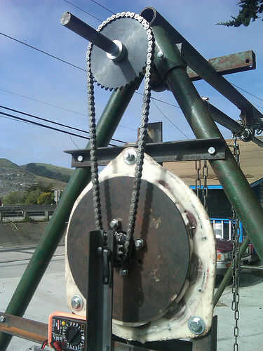 *(UPDATE) el swing set realizado en el área de la bahía Faire de los fabricantes de este pasado fin de semana 21/05/11. Después de haber sustituido el 44 diente engranaje conducido con un engranaje de 112 diente hemos sido capaces de producir constantemente alrededor de 9 voltios. 6 voltios tuvimos 0,3 amperios y 1,2 vatios. Fuimos capaces de funcionar LEDs de 12 voltios, así como EL alambre de 9 voltios y un teclado eléctrico de 9 voltios al mismo tiempo. Creemos que con una Reduccin adicional se produzcan consistentemente 12 voltios. Busque en la Playa exterior este año. Aquí hay un video de él en la Feria de fabricantes: