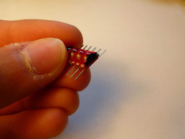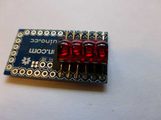 Las pantallas de la burbuja están configuradas para ser puesto en un protoboard, pero puesto que nos va ser Soldándola directamente sobre los pasadores en la parte posterior de nuestro Arduino, los conductores deben doblarse con un par de pinzas. Una vez doblado, descansar de la pantalla sobre una superficie plana y asegúrese de que pone plano y todas sus puntas tocan la superficie. Esto asegurará que hagan buen contacto con los pines de Arduino.