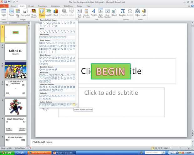 2.) ir a insertar y luego forma (o Slide Show en 2003 y 07) y seleccione botones de acción y la costumbre entonces.