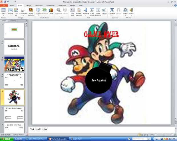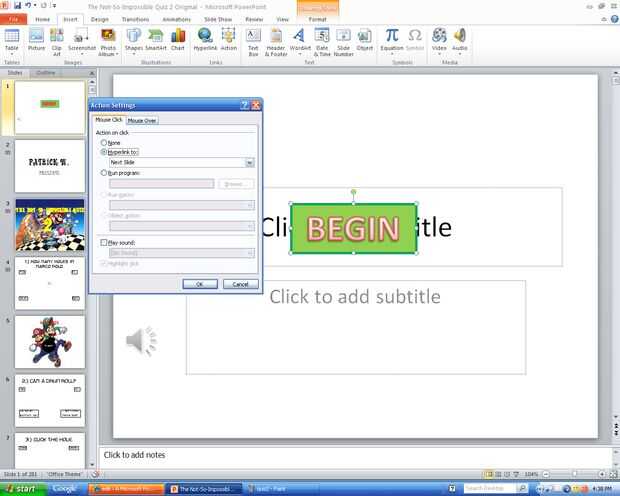 3.) crear otra nueva diapositiva y utilizar esto como una diapositiva de Game Over. Escriba lo que desea y luego escribe "vuelva a intentarlo". Hacer otro botón de acción similar al que en el paso 1, salvo su hipervínculo se remonta a los inicios (en el hipervínculo pantalla clic en primera diapositiva).
