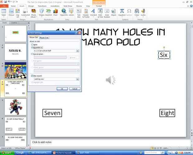 6.) ir a la primera pregunta, en el hipervínculo tire hacia abajo de menú, "Diapositiva..." haga clic en la diapositiva que tu segunda pregunta es sobre. Esto es sólo para asegurarse de que cuando usted haga clic en la respuesta correcta, no ir al juego sobre diapositiva. No tienes que hacer esto para todas las diapositivas.