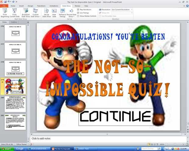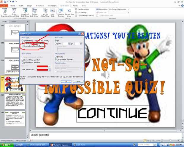 3.) ir a la presentación de diapositivas, haga clic en Set Up Show. Haga clic en el Browsed en bala quiosco bajo tipo Show. Esta manera, nadie puede omitir las preguntas.