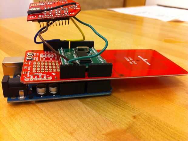 Después de que usted esté listo para soldar los pines del cabezal apilable a los escudos, necesitará conectar el módulo WiFly. Hemos hecho un tutorial entero dedicado a conectar el Arduino a internet con WiFly pero por el bien de este Instructable, sólo siga la sección de soldadura y la conexión de los pernos en el escudo. Se puede ver una imagen de la pila de hardware abajo (con la tabla de Sparkfun).