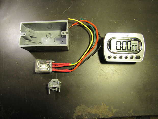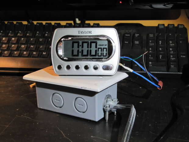 Originalmente planeaba usar un módulo Arduino y RTC, pero decidió por una solución más simple, un temporizador de cocina básica con una función "cuente". Por conectar un relé a través de la tecla Start/Stop, podía controlar fácilmente tiempo acumulado. Costo total fue de cerca de $20.
