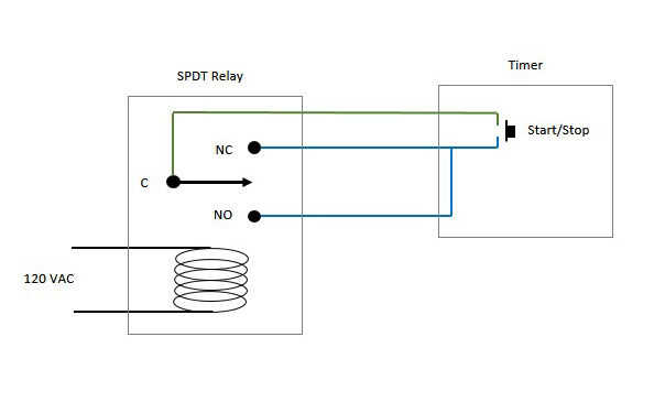 El esquema muestra lo simple que es esto. He añadido los cables al que están conectados a los contactos del relé temporizador. Cuando el relé cambia de estado, "pulsa" el botón Start/Stop en el temporizador y pistas de tiempo acumulado.