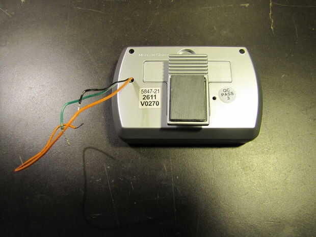 Soldadura 12" longitudes de alambre fino a través de los contactos del botón Start/Stop, teniendo cuidado de no dañar el contacto de metal conductor. Había raspado a un poco de la capa verde protectora para que la soldadura se adhiera a la traza de cobre en el PCB. También he añadido un cable desde el botón "Borrar" para uso futuro.