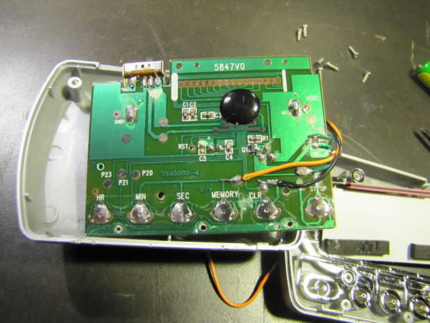 Apertura de la caja es fácil. Primero, quite los dos tornillos en la parte de atrás y use un destornillador de hoja delgado para pop abierto el fondo de la caja. En el interior, quitar los pequeños tornillos que sujetan la placa PC al frente del caso. La pantalla LCD puede tirar lejos el PCB, así que ten cuidado para no dañar los contactos de silicona suave en la pantalla LCD.