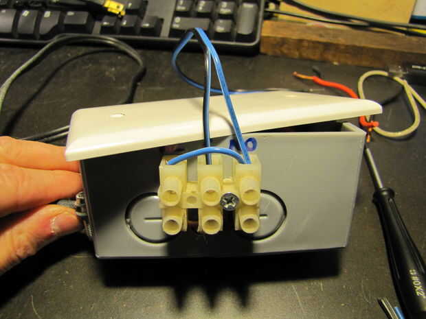 Utilice una placa de salida en blanco para cerrar el cuadro y guardar todas las cosas de alto voltaje dentro. Conecte los cables a los contactos del relé. No importa la polaridad, pero tenga en cuenta que uno los cables va a la "común" en el relé mientras el otro está conectado a ambos el NO y contactos a través de un jumper corto. Conecte uno de los cables directamente, pero deja el segundo cable desconectado - tendrás que romper el circuito brevemente después de aplica energía. En lugar del cable suelto, podría agregar un interruptor (un pulsador NC haría el truco) en su lugar.