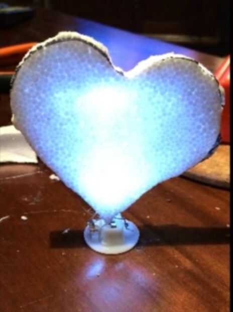 También intentaré inspirarle haciendo un corazón de San Valentín poliestireno que encendido para arriba, ya sea en el color no tan romántico de Icey Blue (no tengo ningún brillante LED rojo en el momento por lo que supongo que estaré solo en el día de San Valentín) y va demostrar el uso de otros materiales semi translúcidos como un pequeño trozo de mineral llamado selenio y plexiglás. El dulce corazón diseño, tacto de acabado y presentación queda a usted – yo soy sólo el diseñador, el inspirador y el instructor.