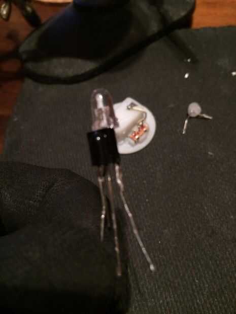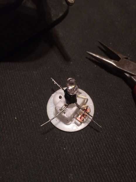 Si utiliza un dispositivo de luz LED existente como la bola de árbol de Navidad miniatura que ves en la foto, abrir la cosa y entender cómo está conectado el LED existente. Averiguar lo que más suele (que es a través de un pequeño interruptor en la parte inferior) y lo que menos es. En caso de duda, utilizar un multímetro.