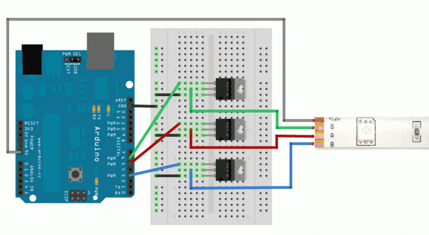Activación de la MOS (uno para cada color) se permite flujo de corriente en el LED, tener más de un LED activo al mismo tiempo da colores mezclados. Este esquema es ideal para una prueba de puño, pero toda la corriente que tu tira se hundirá iría así pensó la placa Arduino, no use tiras demasiado largas.