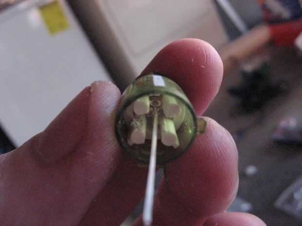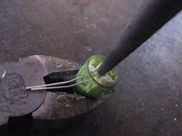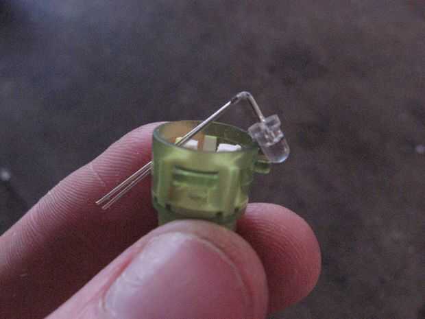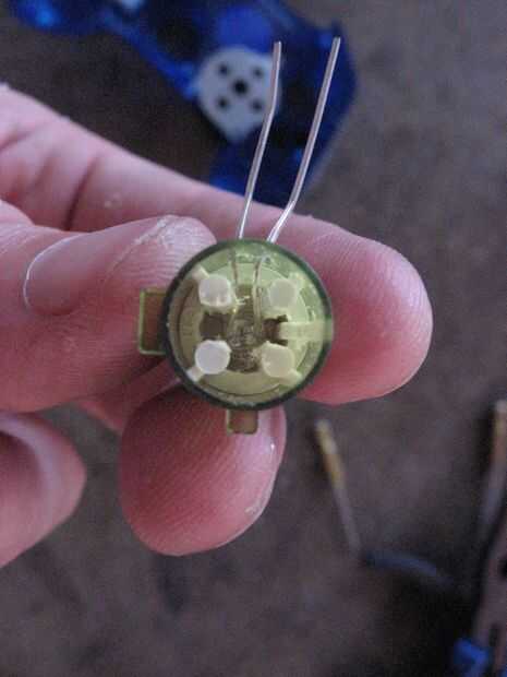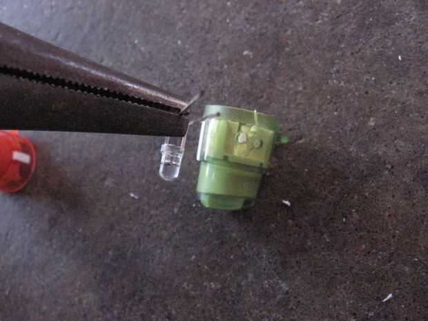 Usted tiene que empujar, doblar y apriete el led en el botón y una vez que la base del LED está en el centro del botón, la mermelada en la parte inferior del botón con una herramienta pequeña o un extremo de su alicates de punta. Los cables y el LED deben ser más allá de los pilares para evitar pulsaciones accidentales.