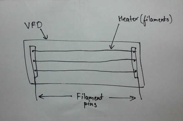 Un VFD tiene filamentos para la generación de electrones. Los filamentos actúan como un Cathode.Filaments caliente generar electrones, cuando Haz calentados, por una corriente eléctrica.