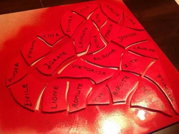 A la derecha hay un nombre del jardín de la infancia - NAMINUKAS con cada letra que se extendía en estas palabras: Naturalumas - naturalidad; Atidumas - atención; Meile - amor; Ismintis - sabiduría; Naujoviskumas - innovación; Uzsidegimas - pasión / entusiasmo. Kantrybe - paciencia; Atsidavimas - compromiso; Sugebėjimas - capacidad.