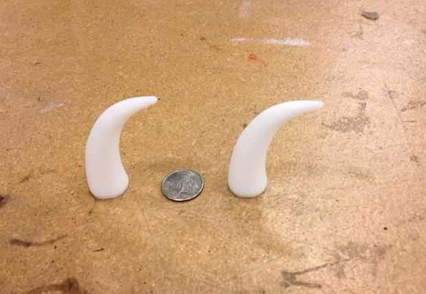 Foto 1 muestra un par de cuernos con un cuarto de los E.E.U.U. entre ellos para dar una sensación de escala. Éstos fueron impresos en TechShop San José en una de sus impresoras de MakerBot. Tiempo de impresión para cada cuerno era unos 25 minutos más tiempo de calentamiento para la cama de la impresora (éstos se imprimen en ABS para que una cama caliente es importante).
