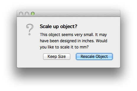 Dejando caer el archivo horns.stl en MakerBot de corte produce la aplicación un aviso de que el objeto es muy pequeño y sugiere el problema era que el archivo fue diseñado en pulgadas. Todo lo que... golpe solo "cambiar la escala de objeto" y a trabajar hacia fuera. Yo juraría que tenía mi archivo establecer a milímetros... :-) La foto 2 muestra la advertencia de que el software de MakerBot publicado (junto con el botón solucionar fácilmente el problema).