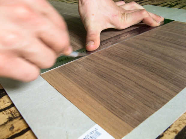 Corte se puede hacer sin marcar nada, pero hice unas líneas con un lápiz sólo por él. Es aconsejable cortar las capas iniciales por lo menos un poco más grande que el tamaño previsto (que debe ser un poco más grande que el papel que utiliza tamaño) permitir el ajuste y algún error inesperado a menos que tenga un doctorado en pegar perfectamente tamaño superficies juntos perfectamente. Un cuchillo de algún tipo debe ser suficiente para cortes adecuados. Recuerde que cuando chapa Corte Cruz grano probablemente dividirá si la hoja de captura en algún lugar (de ahí la necesidad de agudeza) y cuando corte con el grano de la hoja tendrá una tendencia a ir con la dirección de grano natural. Hay varias maneras de evitar eso. Primero y principal aplicarán mucha presión sobre el gobernante u otro borde recto que utiliza como guía hasta la chapa bajo no tiene posibilidad de movimiento de corte medio. También encontré que una hoja redondeada ayuda con el desdoblamiento durante el corte transversal de grano, pero también lo hace con más trazos ligeros con casi cualquier otra hoja. Si tienes alguna zona repuesto de chapa de madera es una buena idea intentar algunos cortes Cruz-grano antes que el que realmente necesita hacer para ver donde (si) vas mal.