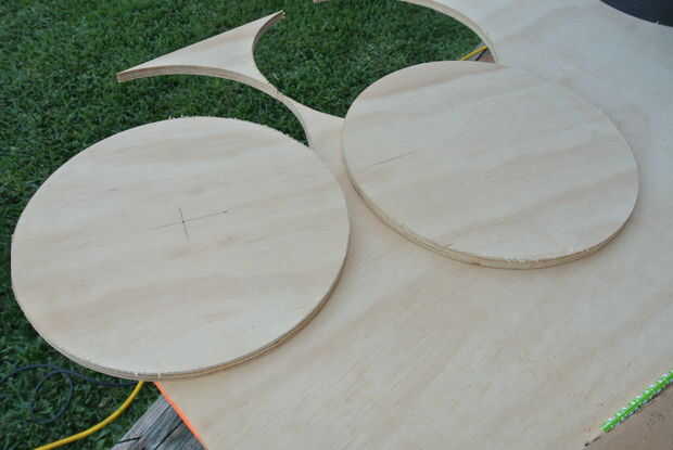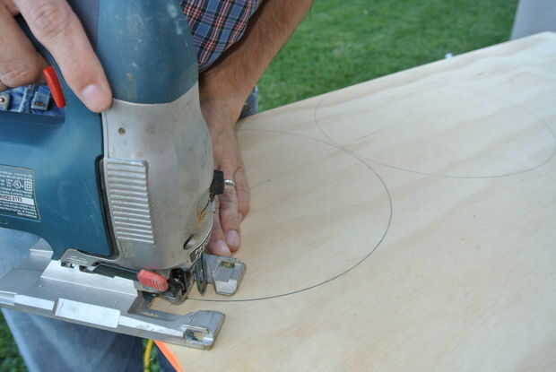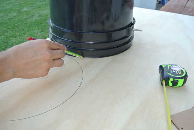 La pieza superior del círculo se puede medir trazando la parte superior del cubo.  Usted debe terminar con dos círculos.  Use una sierra de calar para recortar con cuidado los círculos.  Por favor, recuerde usar el equipo de seguridad (anteojos de seguridad, tapones para los oídos y máscara según sea necesario).  Debe tener dos círculos nice, uno ligeramente más grande que el otro.