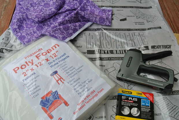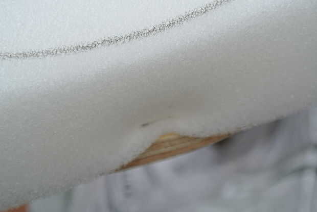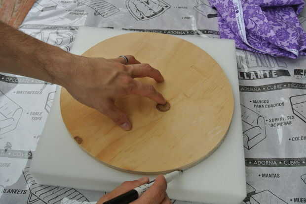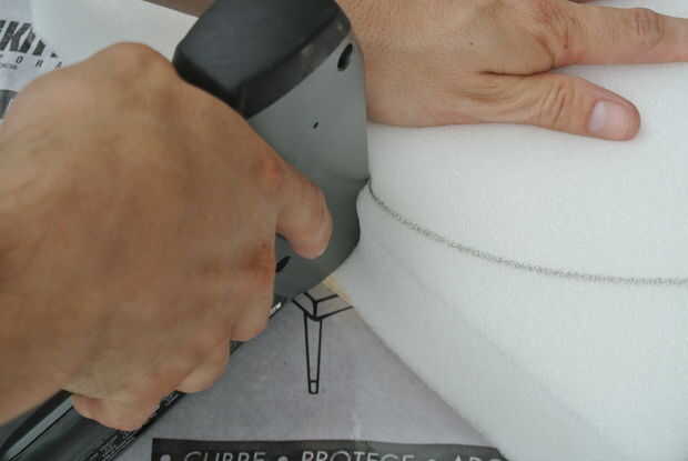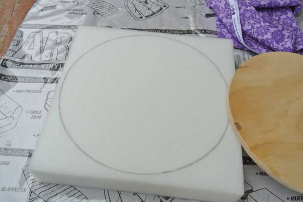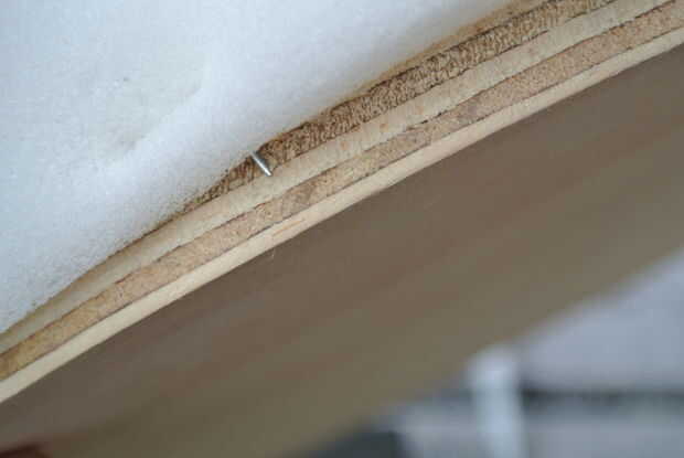 Centro del círculo más grande de la madera contrachapada en la espuma y trace con un marcador. Gire el centro del círculo más grande de la madera contrachapada nuevamente y esta vez con cuidado darle la vuelta sobre y espuma sobre. Mientras sujeta firmemente la espuma sobre la madera contrachapada, empuje la engrapadora a medio camino encima de la espuma en una prensa en cerca de 1/2 una pulgada y borde. Se trata de la celebración de la espuma en la parte superior de la madera contrachapada. Cuando se hace correctamente usted tendrá un pequeño hoyuelo en la espuma. Asegúrese de que la grapa está completamente en la madera y no en parte sobresale como se muestra en la última foto. Tener algunos nariz de aguja alicates prácticos ayudará a recuperar cualquier grapas no conformes.