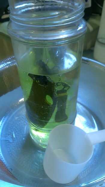 Preste atención! La reacción es rápida, compruebe cada minuto o así hasta que llegue la oscuridad deseada. En el caso de Kershaw, había grabado sólo por cinco minutos, el Spyderco fue grabado para un tiempo de veinte minutos. En realidad, con este reactivo, más de diez minutos es probablemente innecesario.