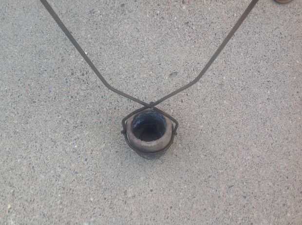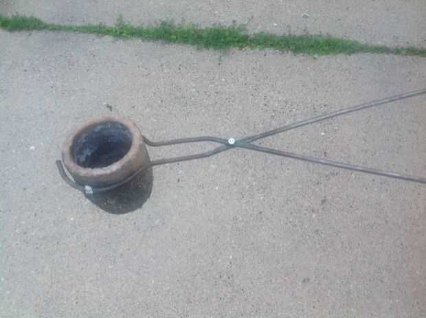 - El crisol y herramientas: Estos son lo que derretir y el aluminio con la manija. El crisol puede ser tan simple como corta un tanque vacío camping del propano de tamaño con la parte superior, pero he tenido algunas malas experiencias con este tipo de crisol ser perforado y caída de aluminio en el horno. Usé un crisol de arcilla y grafito de http://www.budgetcastingsupply.com/. También se necesitan herramientas para manejar el crisol con. Si usted está usando un metal puede como el cilindro de propano, un par de pinzas largas funciona bien. Si utiliza un crisol real, recomiendo edificio 2 pares de pinzas, una a levante con y uno para verter, de 1/4" de acero de stock. Esto es lo que hice, con la ayuda de un amigo.
