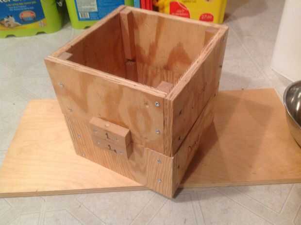 - Los frascos: la contención de la arena, la cope (superior) y arrastre (inferior) moldear cajas de matraz se utilizan para proporcionar paredes firmes para la arena en y en contra de ram. Hice mía como x9x 5""x 9"Cajas contachapadas de embalar (no superior o inferior) con agujeros en bloques de los lados para tacos a deslizamiento. Estas clavijas proporcionan alineación para asegurarse de que los moldes de arena línea derecha cada vez. Este sitio tiene información decente en la construcción de sus propio frascos: http://www.penguinslab.com/furnace4.htm