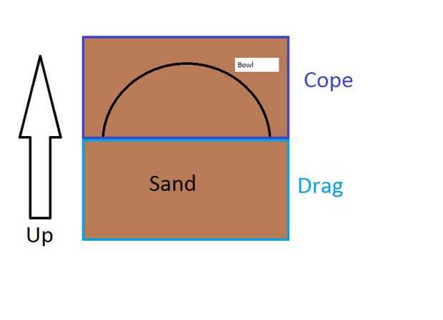 Ahora que tienes el valor de una pequeña fundición de equipos en su patio trasero, es tiempo para obtener algunos resultados. Tomar la taza de la plantilla, que va a hacer una réplica de y lugar boca abajo en el matraz superior (la frente), como la cope encuentra lado derecho hacia arriba sobre una tabla lisa. La ilustración de Microsoft Paint en las imágenes para este paso ayuda a visualizar esta configuración. Después de rociar con algún talco para mejor comunicado y menos pegarse, comienzan a pila de arena no agrupado sobre la taza. Mientras vas, presione hacia abajo firmemente con las manos. Al llegar a la parte superior de la cope, el paquete sobre la arena más y entonces ram tan duro como usted puede con un 2 x 4 o alguna pieza similar de madera. Luego, tomar un tablero largo y raspar la arena sobrante de la parte superior para que los plano. ¡ Yay! Han acabado la primera mitad del molde.