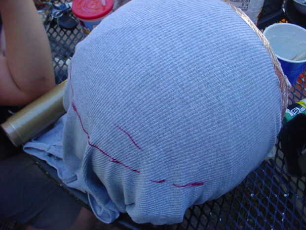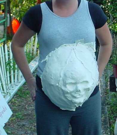 oh esto es pesado y como una nota lateral, masilla sobre plástico no seque muy bien! Hemos utilizado un tanktop como un forro y un gorila pegamento para unir las 2 piezas. Después de todo lo que nos dimos cuenta de un beachball realmente no es en forma de un vientre embarazado!! ! Así. es pesado, frágil y realmente no cabe... tiempo para la fase 2