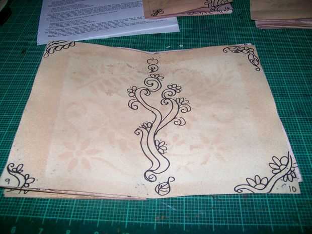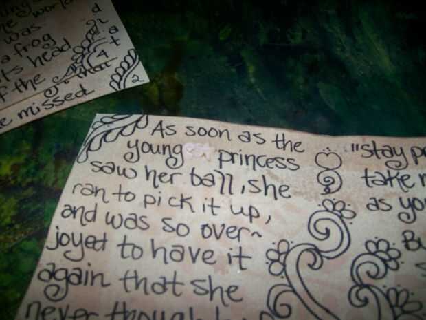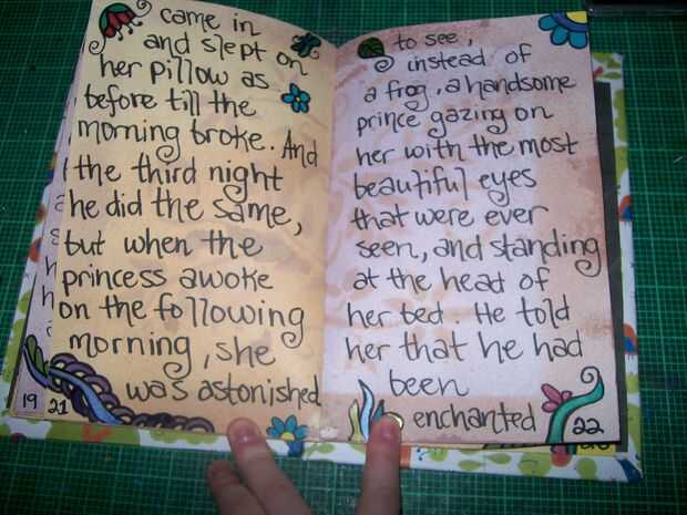 Ahora, esta es la divertida parte. Tomar una firma en la fecha y número de las páginas. El comienzo de la historia no es necesario empezar por el principio de la firma, así que date a un par de páginas en blanco para añadir el título, ilustraciones, etc.. Comencé a príncipe de la rana en el centro de la primera firma y luego contados el resto. Después de esto doodled entonces con mi rotulador alrededor de las páginas. Esta parte que usted tiene que averiguar por ti mismo. Dibujó flores y hojas y vides y muchas otras cosas. Si desea que éstos hacia fuera con un lápiz puede dibujar primero pero cambio de parecer mucho cuando dibujo a veces para asegurarse de que termino una página que utilizar el rotulador, no hay duda permitida.