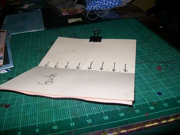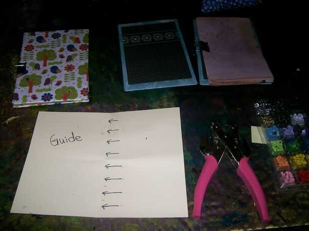 Vas a usar a tu guía y perforar agujeros en una firma a la vez utilizando el punzón. Tenga cuidado y no meter el ojo hacia fuera. Una vez que han perforado los orificios para la firma, use los clips binder para recortar las páginas juntos así que no pierden la alineación del orificio.