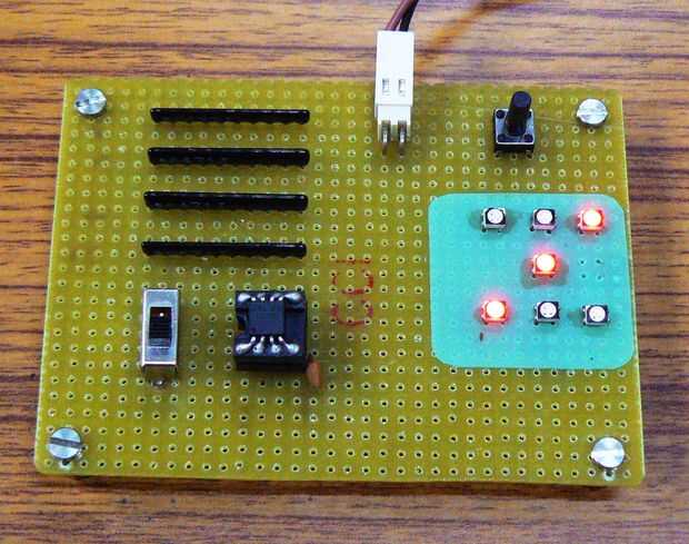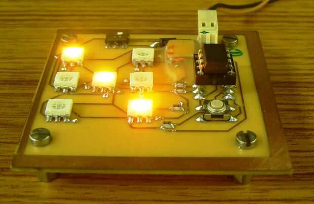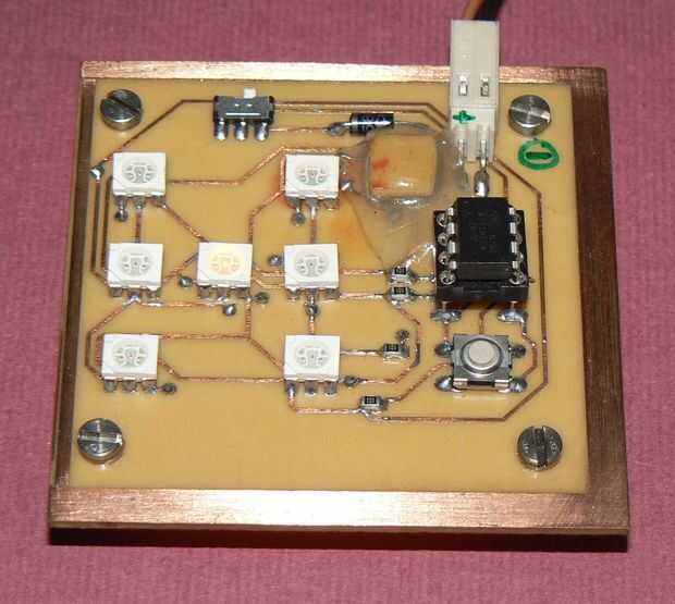 El proyecto utiliza 7 RGB LED dispuestos en forma de dados. Cada LED RGB tiene tres LEDs independientes dentro por lo hace un total de 21 LEDs y se ha controlado por 4 pines de I/O de ATTiny13V Microcontroller.But según la teoría de CharliePlexing, sólo podemos controlar 12 {n(n-1)} LEDs de 4 pines de entrada-salida.