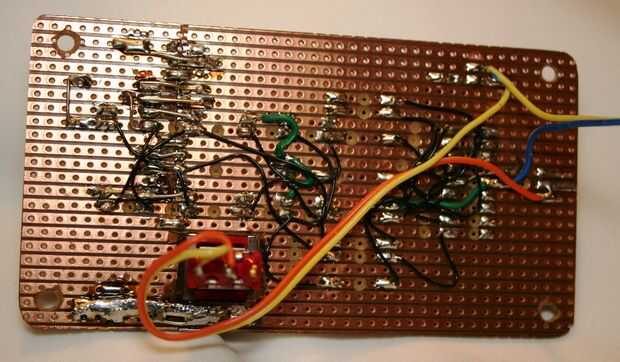 El prototipo fue construido utilizando una tira de Veroboard®. Esto permitió una época de rápido desarrollo a lograrse en el hardware (alrededor de 1 hora). Si usas Veroboard®, mucho cuidado al apoyar el tablero y cortar el agujero para el interruptor de botón, de lo contrario, la Junta se encajarán a presión en la mitad.