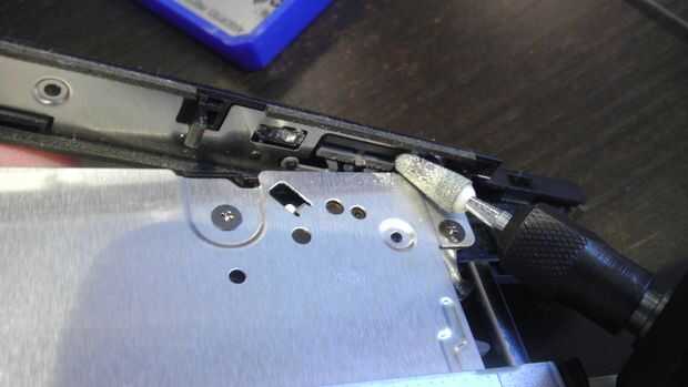 Como se puede ver en la imagen, doblado la placa frontal lo suficiente por lo que pude ver la base del botón. El quid poco pegando la parte de atrás de la placa frontal es lo que empuja el botón real que está en el disco sí mismo. Había afeitado a la broca más pequeña del actuador con una herramienta Dremel y Ta Da! el botón es perfecto!