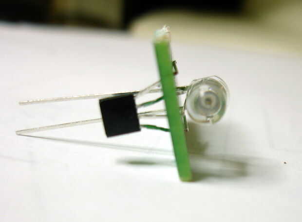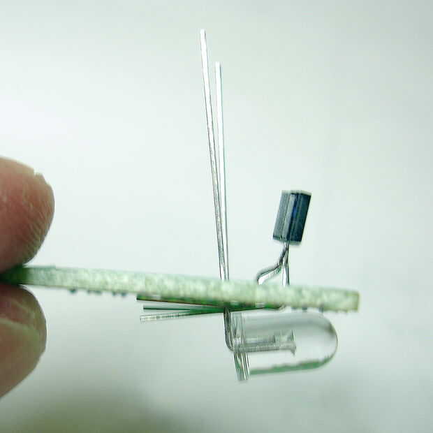 El LED es mejor montado en la parte inferior de la perfboard como se muestra a continuación. La Junta actuará como una barrera de luz, por lo que el IS471 sólo verán la luz que es reflejada de objetos en lugar de iluminación directa de la IR LED, aunque puede que necesite añadir una tira de cinta negra terminada conjunto para impedir que los impulsos de IR a través del holdes en el perfboard.