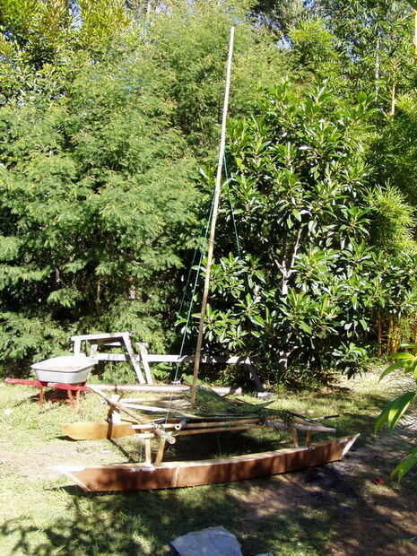 Tuve una bonita pieza de bambú para un mástil pero un mástil de windsurf o tubo de aluminio habría sido mejor. El punto donde la diagonal llaves Cruz miró en torno para un paso de mástil.