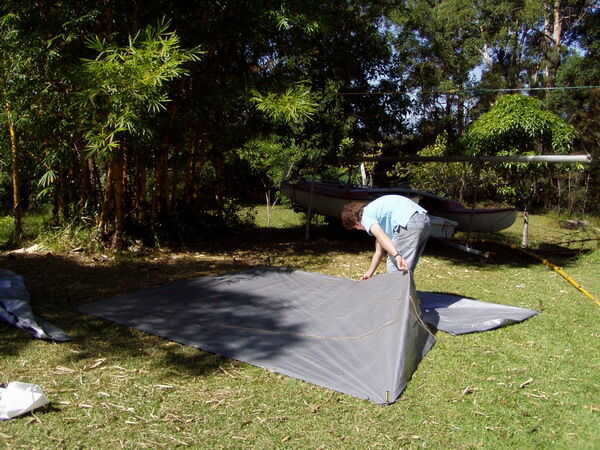 Básicamente compré una lona barata y cortar en algunos bordes ligeramente redondeados darle algunos comba. He doblado los bordes sobre y pegado con cinta adhesiva de baja calidad para crear una funda para los cables de luff/leech en.