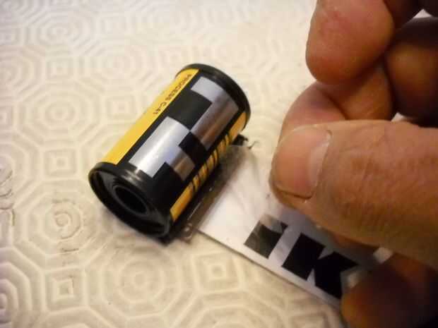 En primer lugar, utilice el pegamento para colocar la cinta métrica para el pequeño pedazo de la película restante en el cartucho (recordar poner cinta adhesiva en la parte posterior para reforzar la conexión)