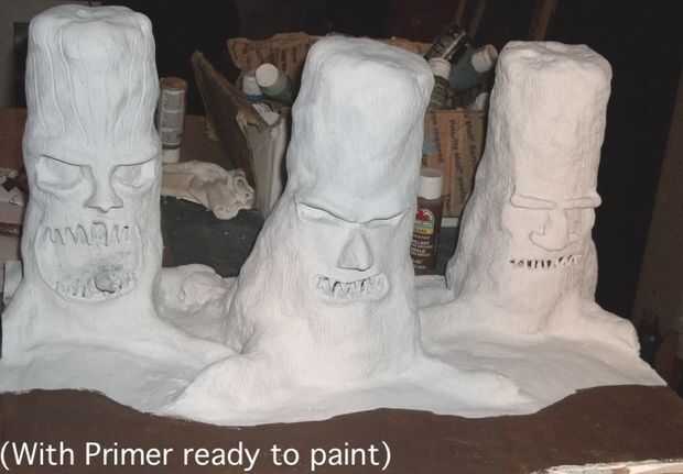 Después de que se enfriaron, estaba listo para comenzar a hacer la caja diorama. Que cortar un trozo de madera contrachapada para la parte inferior de la caja y un plano de donde quería que los árboles para caber. Luego vierte yeso para ponerlos en su lugar. Después el yeso sólido duro, ya era hora a primer todo. (La zona marrón donde pinté es donde el va a la arena final.)