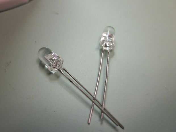 -Dos LEDs blancos ultrabrillantes . Tratar de encontrar la salida de luz mayor a la menor corriente usada. Mina eran 8000 mcd (mili-candela) en a un máximo de 25 ma (miliamps) conseguí en RadioShack.