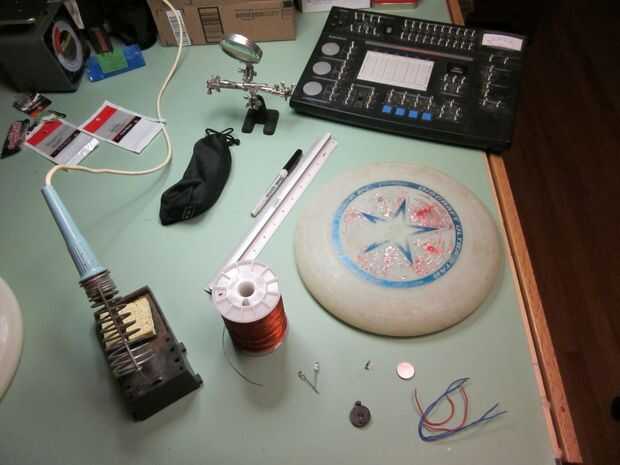 Los discos voladores comercial hacen un buen trabajo de iluminar cada detalle necesario para ver y coger un disco en la oscuridad. Sin embargo se sobrecarga con LEDs y el circuito y tienden a no volar bien. El resplandor en el oscuro discos voladores parecen ser lo contrario, no hay suficiente luz, pero mejor estabilidad de vuelo. Mi enfoque terminó combina las mejores cualidades de ambos, pero no salió ahí. Originalmente quería un frisbee que encendido para arriba, pero había tan buen vuelo como un frisbee normal. Yo había ideado una técnica en la cabeza de la fusión de los cables en el plástico un UltraStar, entonces lavado hacia fuera, haciendo una luz encima de frisbee que era esperemos que mejor. Miré a mi alrededor de mi casa y me encontré con un viejo, resplandor en el oscuro disco volador que compré hace unos años una paliza. Al instante me di cuenta el potencial de esto, si ató un resplandor en el oscuro frisbee con LEDs blancos, podría aprovechar sus propiedades que brilla intensamente, reduciendo así la necesidad de una batería más fuerte y más LEDs, como exceso de luz sería empapado y emitido por el frisbee en otras áreas. Esto también reduciría el peso y tomara menos tiempo instale en mi disco volador. El producto final entonces no parece una normal enciende para arriba el frisbee, sino más bien un brillante disco verde con destellando luces blancas (que gira).