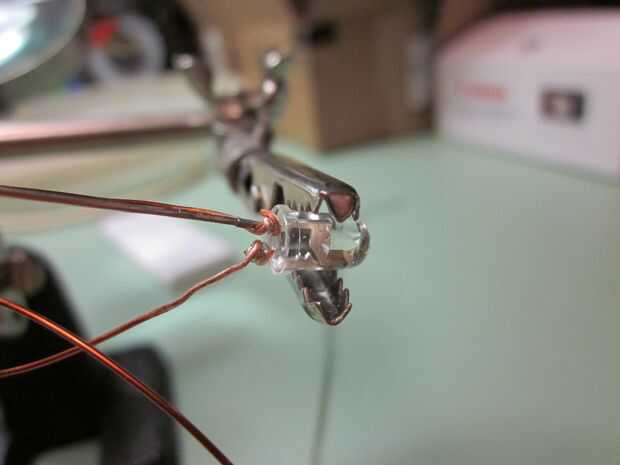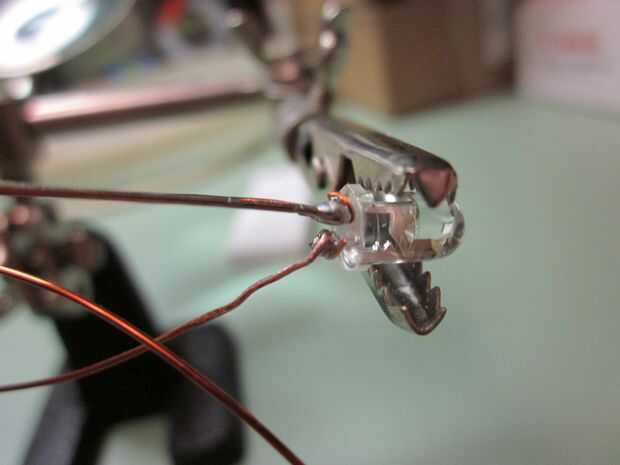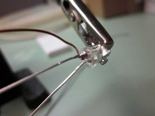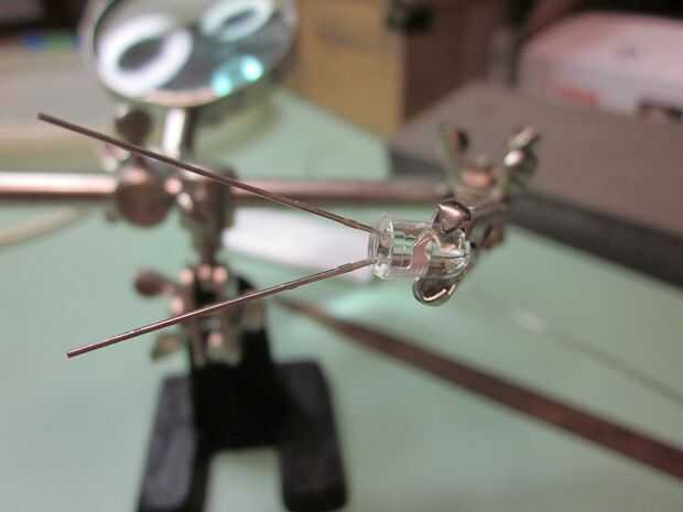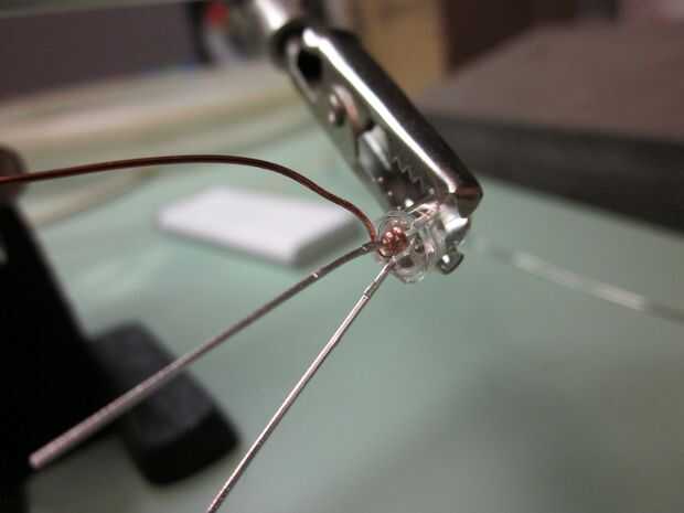 -Modificar los cables de LED. Básicamente esto significa soldadura fina (y asegúrese de que usted hace largo) alambre del imán como cerca de la parte inferior de lo LED como sea posible y cortar con tijeras el exceso. Va ser hundido en el plástico más adelante hasta que sea compacto. No te olvides de arena fuera del esmalte.