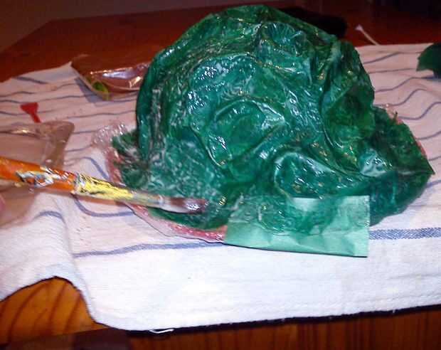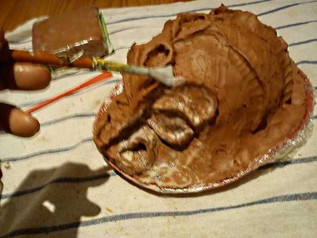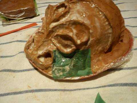 Cuando tienes toda la cabeza cubierta con el papel pegado, pegar un lado de un pedazo de papel y pegue a sí mismo para poner en los lados de la cabeza lo que los hace más resistentes, como se puede ver en las fotos de la duración de este paso.