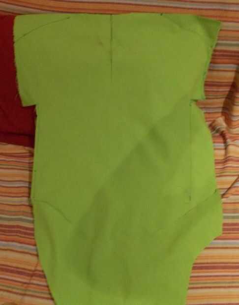 Como se puede ver en la 4 º foto de este paso, doble a la tela por la mitad de la altura y colocar la chaqueta al revés de la tela para utilizar como patrón.