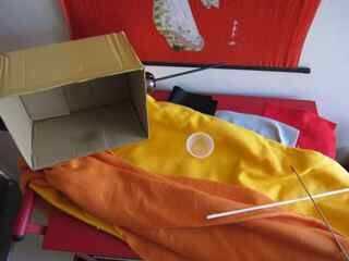 solía aproximadamente 1,5 yardas de tela amarilla y naranja hacen que el cuerpo.  También usé fieltro rojo, gris y negro para hacer los detalles como los ojos y los puntos.  Para la cabeza utilicé una caja de cartón, tazas de fruta de plástico vacías, pasador de madera y fieltro.