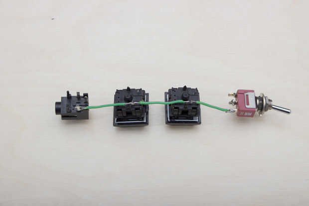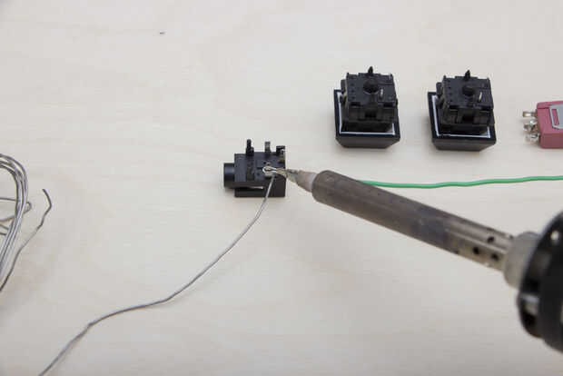 El primer bit de queremos soldadura en alambre es el alambre de tierra. Empezar por esto soldar en el conector de tierra de su conector de audio. Desea soldar a un lado de cada interruptor. Asegúrese de que insertar sus interruptores en el gabinete primero si tienen que ser. Estos switches Cherry teclado mecánico necesario insertar a través de la primera.